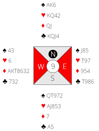 Med naturlig system og sterk NT, 15-17 åpner Nord med 1 ruter. Øst har god åpning men egen naturlig åpning er jo dermed opptatt og pass foreløpig er ikke uaktuelt selv med 14 hp. Dobling uten nspar er rissikabelt. Over pass østfra hopper nok Syd direkte til 4 spar, sterk langfarge men ikke særlig sterk og Vest har et dilemma. De fleste våger seg frampå med 5 kløver men hjerter e også fristende siden makker normalt har minst 3+ der. Det lukter fordelinger bordet rundt men Nord melder nok 5 spar åkke som er? Best ut var Lars Helgesen med Trond Juliussen med 5 spar doblet hjem av Lars. Den andre ytterlighet sto Morten Andresen- Jan Erik Olsen med 4 hjerter doblet hjem av Morten i Øst. Vet ikke hvordan det ble Øst som var spillefører.