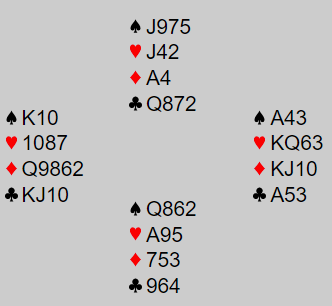 Men Grude fant et frekt spill etter første gang ruter. Han var nok ganske sikker på at spar satt 4-4, så det kunne nesten ikke koste å prøve seg med hjerter før ruteren ble godspilt. Så etter en runde ruter spilte han hjerter dame fra hånden. Da blir det også ni stikk om syd tar for esset og spiller spar. Men syd gikk i fella og la liten hjerter. Etter hjerter dame hadde vunnet stikk spilte Grude ruter til nords ess, og han spilte mer spar til østs ess. Mot slutten "sniffet" spillefører hvordan det satt og tok sjansen på kløverfinesse gjennom nord. Da ble dett 2+1+4+3 = 10 stikk, og +630 til Ø/V ga 90,9% i Superfinalen.