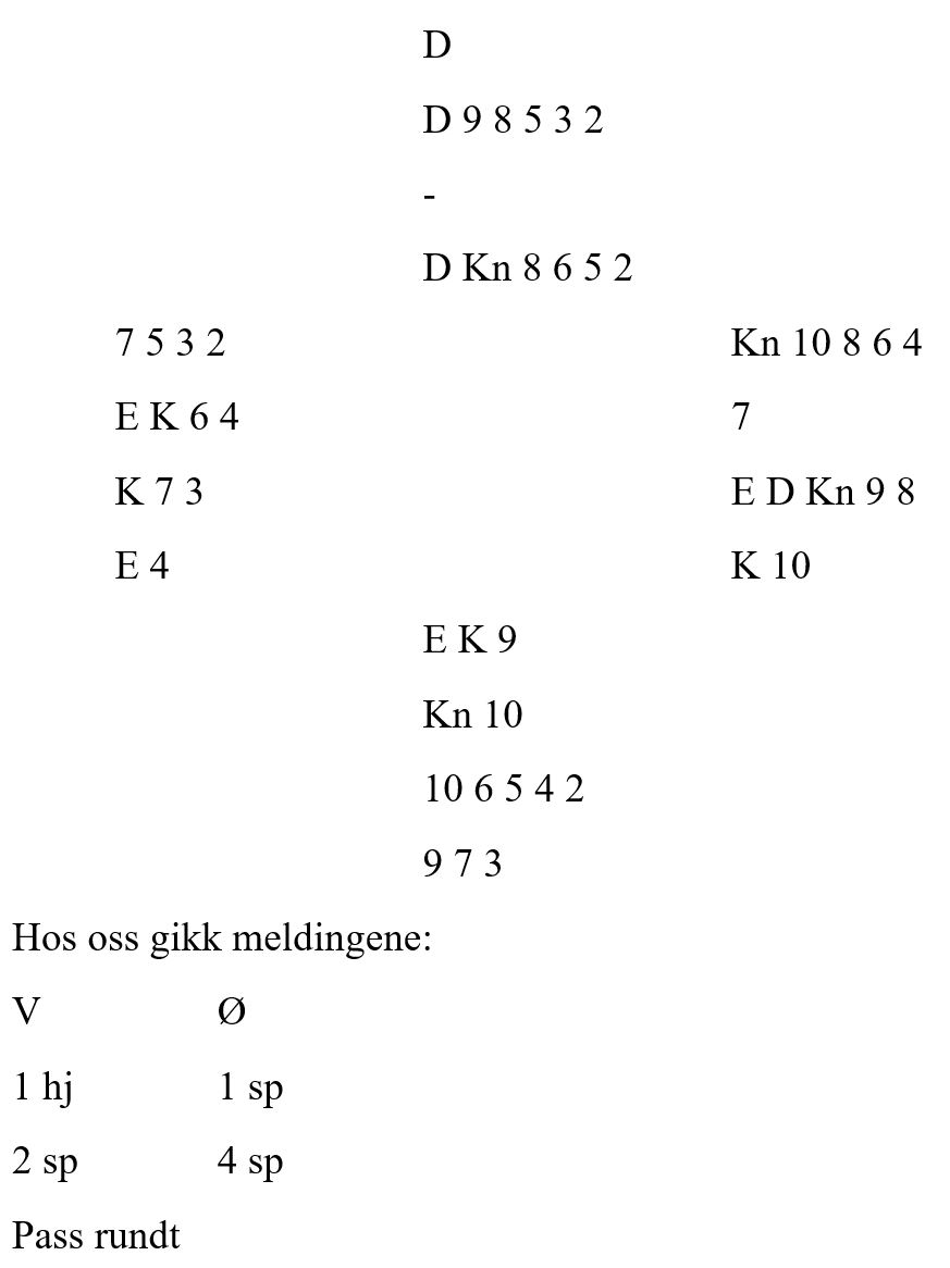 Ved alle de andre bordene som var i 4 spar, kom hjerter knekt ut, og dermed var det ti lette stikk. Grunnen er nok at Vest har åpnet med 1 ruter, og Nord har gått inn med hjertermelding.