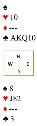 Du kan også trumfe den tredje ruteren lavt, så ta for trumfesset og spille hjerter til hånden. Da bør du i så fall spille hjerter dame, for om øst har kongen er det ganske sannsynlig han vil dekke siden har ser Q-10-x hos nord. Men om han ikke dekker bør du spillle esset, for her er det mange flere sjanser enn at hjertersaksen går. For du du har altså oppdaget skvissjansen. Og kløveren kan jo gå fra start. Etter å ha trumfet to ruter behøver du kun fire kløverstikk.