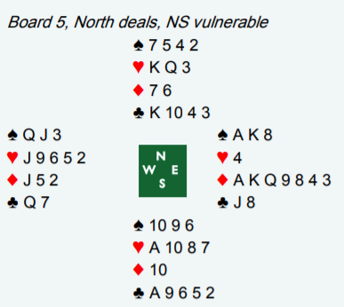 Etter pass fra nord og 1 ruter fra øst svarte vest 1 hjerter. Øst hoppet til 3NT. Det betyr selvsagt for de fleste en sterk hånd. Men med for eksempel 18-19 balanserte sies 2NT. Så det er en vanlig definisjon at 3NT gjenmelding innebærer en meget sterk hånd med en god, lang farge (her ruter).