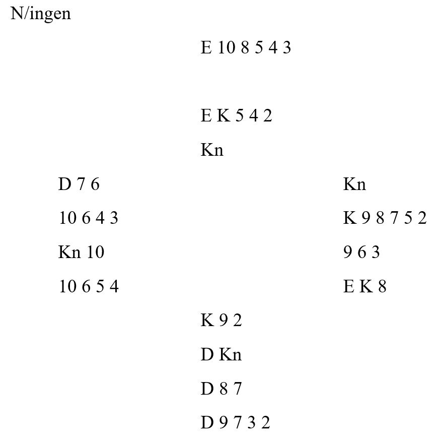 Han stakk med ruter ess, tok for hjerter ess-konge (vest la damen som falsecarding), så kløver. Øst kastet en ruter og syd stjal . Så ruter til kongen og nok en kløver. Øst kunne ikke gjøre noe fra eller til og kastet en hjerter. Deretter fridde spillefører seg med en ruter til vests dame, og disse kortene var igjen: