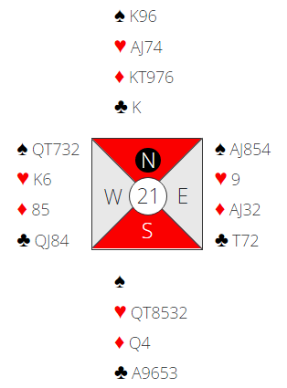 Jeg regnet hjerterfargen som gående og med ruter konge fjerde har vi minst 9 til sammen. Langfargen min vil normalt gi de avkastene Nord trenger, så dermed ble det sjekking av key card hos makker med 4 NT. Da 5 kløver kom, det viser 1 eller 4 av de 5 essene, vet jeg jo at makker har et ess og mest sannsynlig i ruter. Jeg kunne ikke få sjekket opp om damen i ruter var på plass men satset på at 6 ruter kunne vinnes. Det alternativet jeg hadde var jo simpelt hen å avslutte med mye mer beskjedne 4 hjerter.