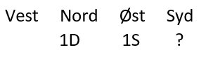 Vi var i gunstig sone med Terje (N) somgiver og det startet med to ganger pass til meg. Gode kort i hvert fall hvis det er tilpasning og etter 1 hjerter fra meg med pass fra Vest svarte Solli 2 ruter. Det lover 10+ poeng og 5+ i fargen og da vokste min hånd nærmest til skyene i styrke. Hva ville du gjort videre?
