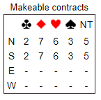Men se på kortene imot, de vinner jo 4 spar like enkelt. Vest er såpass honørsterk at han kan slutte seg til at Øst minst må ha 6- kort sparfarge. Da er «Loven om totle antall stikk» av Larry Cohen relevant vurderingsmiddel! Å bruke for å bedømme hvor høyt man bør være med å kjempe! Vest regner at N/S har 5+5 hjertere og Ø/V 6+2 spar. Det blir totalt «18 stikk» og står 4 hjerter med 10 vil loven tilsi at Ø/V kan vinne8 stikk i spar og da er 4 spar bare 2 doblete beter, men her altså pga flott fordeling vinnes faktisk 4 spar, i hvert fall hvis Øst klarer å telle seg fram til fiskn a kl D i syd.