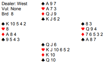 Standard kontrakt var naturlig nok 4 hjerter. Over min grandåpning overførte Jacob til hjerter, og over 2 hjerter fra meg tok han sjansen på å foreslå 3NT. Den sekvensen viser normalt femkorts farge og gir grandåpneren et valg mellom 3NT eller 4 i majorfargen. Åpenbart tenkte syd på parturneringselementet. Jeg hadde 3334 fordeling med honnører over alt, og tenkte også parturnering og at her er det sikkert et spill hvor vi skal spille grand i stedet for trumfkontrakt med åtte majorkort til sammen (vi hadde ni, men...). Så 3NT ble kontrakten, og øst spilte ut ruter 3, fjerde høyeste. Vest stakk med ruter ess og spilte ruter 8 tilbake. HVordan ville du spilt videre?
