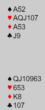 Som du ser, 6 hjerter står normalt lett og selv med ev. 4-0 imot er det godt håp om å etablere 12 stikk. Ta hj A først og en Jxxx blir da avslørt og kan fiskes opp. VI klarte bare å komme i 5 hjerter og det ga oss bare 8-18 i score mens 6 hj med 12 ga hele 23-3, det var altså 4 par av 14 med i spillet som kom i 6 hjerter.