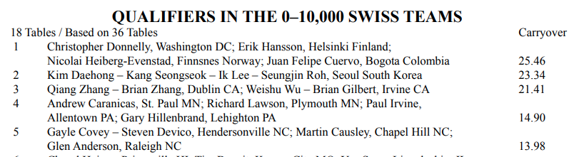 Gorm Norstad (N) og Roar Johansen (S) var motstandere. Arne (Ø) passet selv om 2 spar, Tartan med 2- farge hånd kunne vært OK alternativ. Men vi skal da helst ha 5-5 i fargelengder. Etter pass åpnet Roar med 1 ruter, jeg passet og Gorm fortsatte med 1 hjerter som er minst rundekrav. Nå kom Arne innpå med 1 spar og Roar viste god hånd med hopp til 3 ruter. Jeg var «dum nok» til å meldte 3 spar, håp var jo der å bli doblet med mulige -3 og 500 ut, men det var mindre aktuelt, for Norstad gikk rett i 4 NT (5-ess BW med ruter som trumf) og da Johansen kunne svare med 5 spar (2 ess, ru K= 5. ess, samt ru D) var de alt for høyt siden to ess manglet. Men etter betenkning valgte Gord å avslutte med 6 ruter med sin single 7- er som støtte til makker.