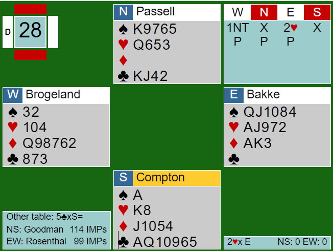 Ved det andre bordet var Ida Wennevold og Gunn Helness i 6NT med vest som spillefører. Med spar 10 i utspill stod den, +1440 og 17 IMP.