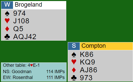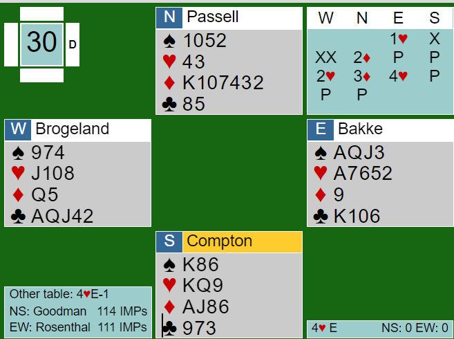 Mine lagkamerater stoppet også i 4NT. Heldigvis meldte Ø/V 6NT med øst som spillefører mot oss. Min makker Nick Jacob doblet og tok to ruterstikk. Greit nok, så slapp jeg muligheten for å bomme et så ekkelt utspillsproblem...