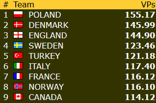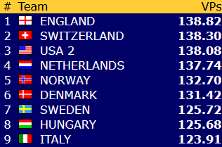 I dameklassen ligger Norge på 8.plass etter en storseier i kveldskampen mot Marokko. Norges veteraner sliter, men fikk en fin seier mot USA 2 i kveldskampen i går. Norge ligger der på 19.plass (av 24), og det er på tide å begynne klatringen