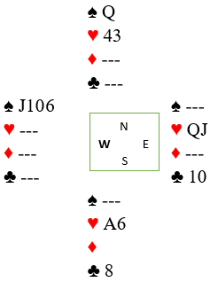 Åpningen ar «svake 2»- men Jan du har jo 4- kort major sidefarge! Er da åpningen korrekt? Men nå spilte Torfinn ut kl A og fikk nok hakeslepp da ru A dukket opp ib ordet, nesten sikker på bet måtte han ha vært? Spar 2 opp igjen fra Wilhelsen og Jan vant med kongen og spilte ru 10 med liten fra Øst. Hva bør bordet legge?