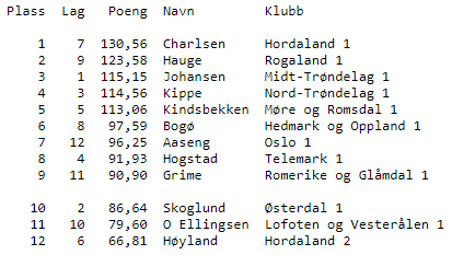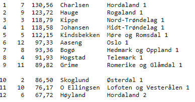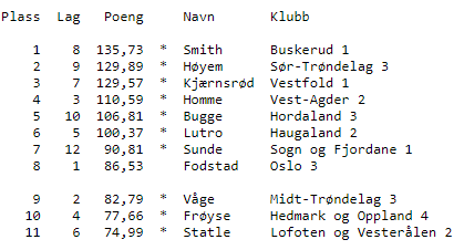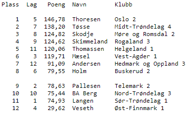 Med fire-fem spill igjen leder CHARLSEN med 16-2. Både KIPPE (mot Hauge) og JOHANSEN (mot Grime) har fått opp bra ledelse i sine kamper. Alle de tre lagene har gullsjanser om CHARLSEN skulle slakke av. Vi kommer tilbake med halvtidsresultatene om litt.
