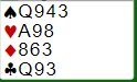 Hvis en bruker det slik er 3 hjerter et alternativ, men jeg synes absolutt 2 hjerter er greit med disse kortene, altså. Det ser ikke ut som om AQJ i spar har full verdi med åpneren bak deg, og det finnes skarpere 10-poengere med femkorts farge som kanskje er mer aktuelle for den nevnte meldingen, om avtalen da er slik at dobbelthoppet viser den type hånd.