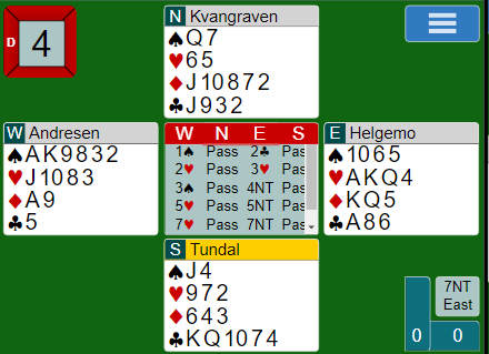 Det skjedde fordi de også hadde 4-4 tilpasning i hjerter, og da den fargen ble satt som trumf i meldingene, og Helgemo på et tidspunkt sa 5NT som storeslemsinvitt, mente Andresen AK9-sjette i en for dem sidefarge burde være godt nok til å få etablert sparfargen med en stjeling eller to i hjerterkontrakt, og han hoppet til 7 hjerter! Helgemo korrigerte til 7 NT hvor det ville blitt tre bet om ikke sparfargen hadde vist seg å være gående (kløver konge kom i utspill).