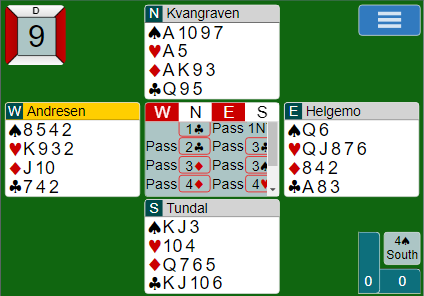 Men i neste spill fikk lag KINDSBEKKEN spille 4 hjerter som greit ble vunnet hvor lagkameratene fikk være i fred i delkontrakt andre veien. Delkontrakten ble sogar vunnet, KINDSBEKKEN 13 IMP.