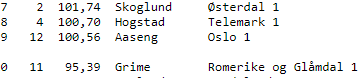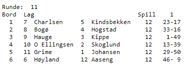 Idet det er igjen kun 5-6 spill i de fleste kampene er Hordaland/CHARLSEN kun 3,1 VP foran Nord Trøndelag/KIPPE. Kun et par VP bak dem igjen ligger Midt-Trøndelag/JOHANSEN.