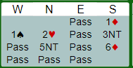 Nord sin 5NT var "pick a slam", og da syd foreslo ruterkontrakt satset nord på at det ville være bra nok ruterfarge hos syd. Jeg er ikke sikker på hvordan syds gjenmelding 3NT ble oppfattet/er definert, men det kan jo synes som om nord tok det som god hånd med ruterfarge?