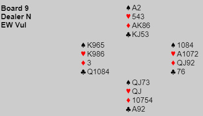 Ved det andre bordet spilte øst ut hjerter og Ø/V tok fire stikk. Spillefører kan ikke vinne ni for egen maskin, det må bli en eller to bet. Da han gikk to bet ga spillet 11 IMP tik Studentenes BK 3.