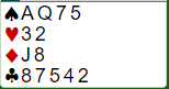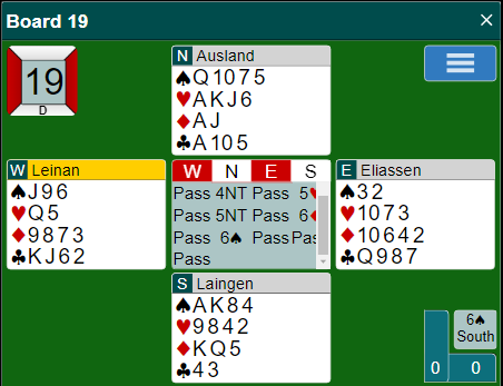 Vest har i alle fall lang god ruterfarge og sterke kort, og øst lang hjerterfarge. Og vest har meldt 3NT underveis. Uansett skal du altså finne et utspill mot 6NT.