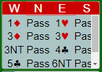 Du hørte et meldingsforløp som kanskje ikke er til så stor hjelp for nord, og kanskje også litt usikkert for eksempel med hensyn til østs 4 kløver., og østs 5 kløver (har dessverre ikke den informasjonen).