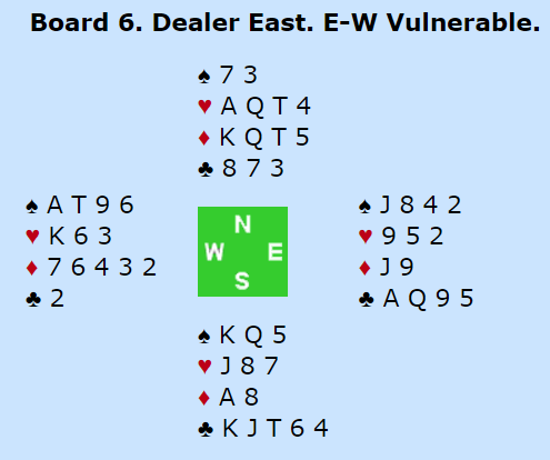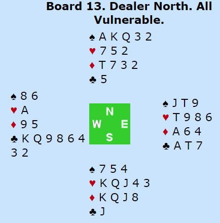 Arve Farstad (vest) var i 5 kløver doblet og vant den. Det er vanskelig å se hvordan den skal kunne vinnes om nord simpelthen spiller tre ganger spar. Det oppstår ingen skvis (nord kan holde ruteren), selv om det kan se litt ut som en mulig criss-cross skvis mot syd. Men 5 kløver ble vunnet noen andre steder også. Helgemo vant også 5 kløver doblet i Norge sin kamp i åpen klasse mot Island. Der kom to store spar ut, og nord visste at det ikke var flere sparstikk å hente. Så han skiftet til hjerter, uvisst av hvilken grunn, for det er vanskelig å se at hjerterskift kan haste i dette motspillet? Det er kanskje mulig, hvis det for eksempel haster med å ta hjerterstikk (da må vest har noe sånt som singel ruter konge og kan få kastet hjerter?), men skift til hjerter ble i alle fall fryktelig galt her.