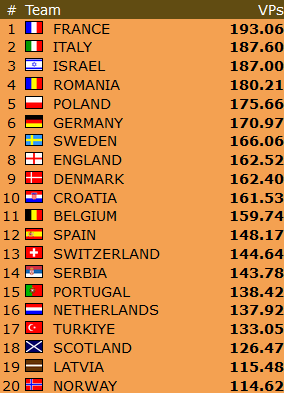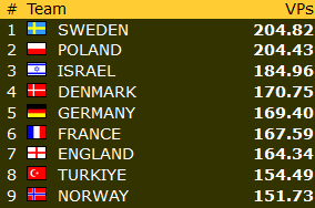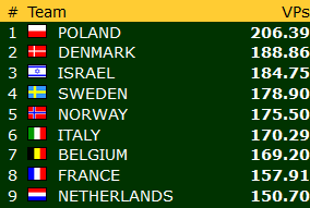 Norge SENIOR ser ut til å klare det som nok var hovedmålet deres på forhånd, topp-8. Intet er sikkert med fem kamper igjen å spille, men marginen ned til den triste niendeplassen er nå 25 VP. Ser en oppover på listen er det kun 9 VP opp til bronse!