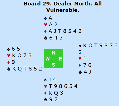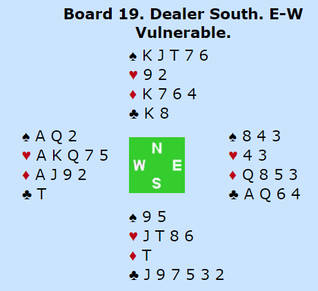 Kløver konge satt i saksen, så en vanlig klubbspiller ville også vunnet 4 hjerter. Dermed ga ikke spillet særlig utslag, Skottland Ø/V var i 3NT og fikk ni stikk, 1 IMP til Norge.