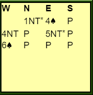 Vi fikk melde i fred. 1 ruter fra Solli, svar 1 spar fra undertegnede og gjenmelding 2 ruter. Men 17 hp måtte noe gjøres og derfor krevde jeg til utgang med hopp til 3 hjerter. I mange tilfeller lover det 5- kort og Terje la derfor på til 4 hjerter med sin gode 3- kort støtte. Da gikk jeg på med 4 NT, 5 ess Blackwood med hjerter som trumf og Solli svart 5 hjerter, 2 av de 5 essene (hj K= ess) men uten hj D! Hva ville DU meldt nå, passe eller gå i slem- og i tilfelle hvilken? Jeg valgte å avslutte med 6 hjerter, 5 NT kan ikke meldes siden vi ikke sikkert har alle fire «ekte» essene.