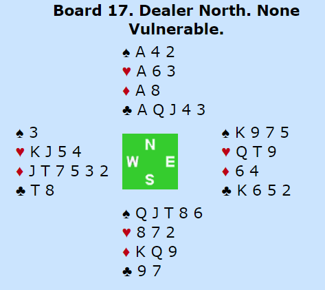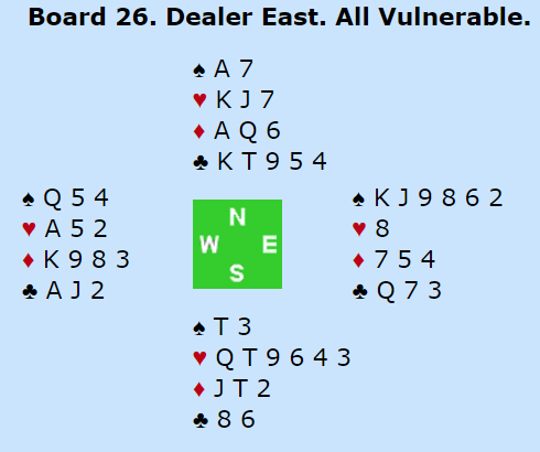 Ved det andre bordet spilte syd 4 spar og fikk ruter i utspill fra Geir Helgemo (vest). Nå startet vel latvieren litt klønete da han stakk med ruter ess, spilte ruter til kongen og dro spar dame som fikk seile til Tor Eivind Grude sin konge. Han skiftet til hjerter 10 til esset. Spillefører forsøkte seg med liten spar til syd og den tredje ruteren med avkast av en hjerter. Men øst kunne stjele og spille trumf som tok bort nords siste trumf. Forsvaret hadde to stikk, og da øst kom inn på kløver konge hadde de to stikk i hjerter også, to bet og + 100. Det ga 11 IMP til Norge.