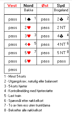 Men altså å tenke skvisinnspill er muligheten for å tråkke seg bet her. Det var nettopp det som skjedde fikk jeg bekreftet fra Christian Bakke akkurat nå. Og Brogeland hadde vært med på å tegne dette bildet for spillefører da han som syd gikk innpå med 2 spar etter starten 1 hjerter fra vest og 2 kløver (en flertydig, kunstig melding) fra øst. Da er det kanskje ikke så rart at vest plasserte kløver konge hos syd?