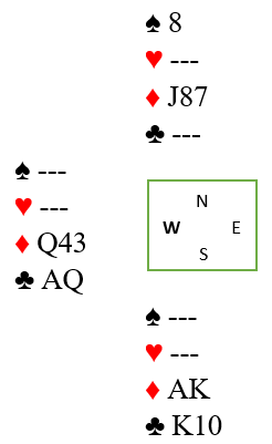Du oppdaget vel at her er du også avhengig av ruterfargen. Den må gi deg mange stikk. Spiller du spar til kongen og ruter mot bordet kommer kongen deisende fra Vest. Da kunne det spilles ruter hjem til 9-eren og på sp D sake kl 2 i bordet. Alt Øst da kunne få var et stikk i trumf siden det der bare var dobbelton i spar men sammen med 4- kort trumf.Trumfer ikke Øst sp D kan bare Olsen trekke ut trumfen og inne på hj K forlange 13 stikk!
