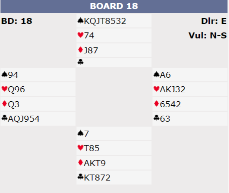 Mot 6 hjerter spilte Kjell Aadahl ut sp 5 og det så greitt ut å vinne. Men da trumf A og D etter sp A ble trukket var Jan Thore Karlsen i Øst med 10xxx med å lage problemer. Hvordan ville du løst dem, du rensker jo deg selv for trumf hvis du trekker 4 runder trumf? 3 par var in6 hjertrer, bare Jan Erik klarte seg, og av 4 andre i utgang var det bare ett som klarte å få 12 stikk i 4-5 hjerter.