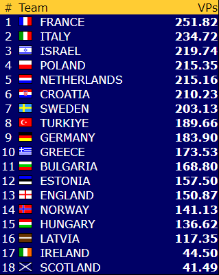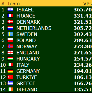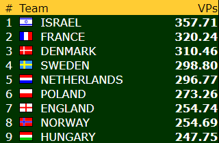 Danmarks 5 hjerter doblet med tolv stikk ga +850 og med dobbelscoren +2160 for doblet utgang en vei med overstikk og doblet slem den andre veien med overstikk innkasserte de hele 20 IMP for dette spillet.