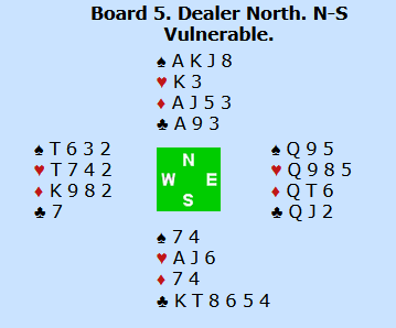 Og det var rett å melde over 5 spar og, forutsatt at man ikke finner utspillet mot den kontrakten. Men å melde slem N/S er feil i teorien siden 5 spar er to bet og 6 ruter/hjerter en bet. Så ble det noen sekunder plutselig rett å melde 6 ruter, for N/S fikk på en måte motparten dit de ville da Ø/V gikk i 6 spar. Men det utviklet det seg til et skikkelig katastrofespill når utspillet ikke ble funnet mot 6 spar.