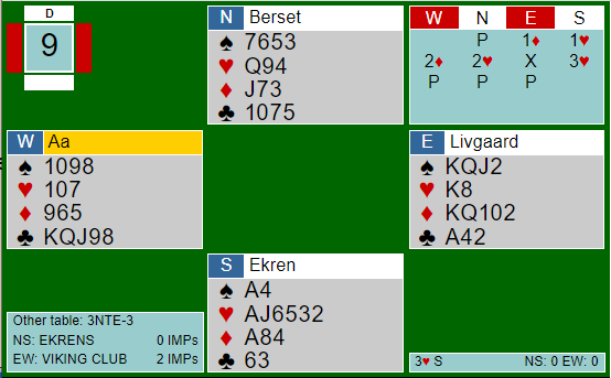 Ved det andre bordet åpnet øst med 1 sterk kløver. N/S var med, og Ø/V havnet til slutt i 3NT. De har tross alt 24 HP og en god langfarge som gir stikk, og man har gjort dummere ting enn å prøve seg på soneutgang med det! Men her var det ikke tingen. Etter hjerter ut til damen og kongen var det med disse kortene kun seks toppstikk. Så snart N/S kom inn hadde de fem hjerterstikk og to ess, tre bet. Det ga +300 til VIKING CLUB, 8 IMP ut for lag EKREN, IMP de godt kunne tenkt seg å ikke tape i denne turneringens fotofinish.