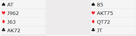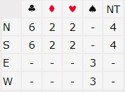 Nord og Syd passer mens Øst åpner i 2 kløver i 3. hånd. Vest har fin fordeling med 6 hp og hvis man ikke bruker avventende 2 ruter- svar er det ikke unaturlig å strekke seg til positive 2 hjerter selv om 6 hp kanskje er vel hardt. Over 2 hjerter kan Øst da svare 2 NT med sine 21 hp og semijevn hånd. Da blir det for hardt for Vest å vise sin andre langfarge og løft til 3 NT dermed mest sannsynlig bud. Av 16 bord kom 8 i 3 NT, alle av Øst. Det skal med aktuell sits ende opp med 11 stikk siden Syd får for hj A ‘og K. Ved de andre bordene ble kontrakten spilt i ruter, men3+3 på Vest sin hånd. Der kan man dedusere at Vest har svart 2 ruter på makkers kravåpning. Men av de 18 bordene i ruterkontrakt kom 9 i vanlig utgang mens de 9 siste spilte 6 ruter. Der har nok Øst i 2. runde vist sin lengste farge, 3 ruter, og Vest enten meldt 3 hjerter (5+ og 4+ hp hvis naturlig) eller støttet direkte med 4 ruter. Bruker man dobbelt avslag kan 3 hjerter (mulig 0-3 hp) bli besvart med 3 NT av Øst der Vest så naturlig kan invitere til utgang+ med 4 ruter. Da går Øst på med 4/5 ess Blackwood og lilleslem som er flott kontrakt kan nås. Alle lokale lag i A- puljen nådde den utapelige slemen.