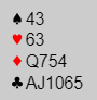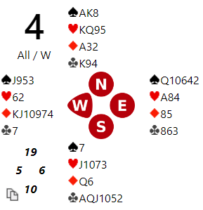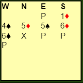 Der åpningsmeldingen var 1 kløver valgte lag KIPPE sin vest ruter 5 i utspill. Ved det andre bordet hvor beste minor 1 ruter var åpningen valgte HAUGE sin vest spar 4 i utspill. En kan vel si at utfallet av slikt ofte er litt tilfeldig. Og denne gangen varf det slik at om spar 10 og ruter 10 bytter plass i dette spillet ville ruter ut vært best, men slik det så ut var sparutspillet bedre.