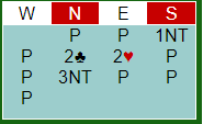 Etter pass fra vest meldte Christian Bakke (nord) 2 kløver - Stayman. Øst kom innpå med 2 hjerter. Boye passet, og da det kom tilbake til nord meldte han 3NT.