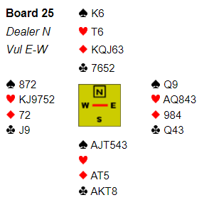 Jeg synes ikke syd gjorde noen god innsats i dette spillet da han altså plasserte nord i 5 hjerter. Mot den kontrakten spilt av nord kom ruter knekt i utspill, og det endte med tre udoblede bet i sonen, Ø/V + 300.
