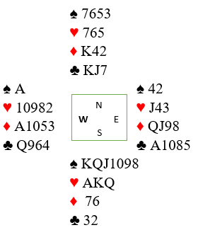 Etter pass fra vest og nord åpnet øst med 1 spar. Syd meldte 2 spar – Michaels Cuebid – dvs. hjerter og en minorfarge, minst 5-5.
