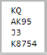 Ett par gikk fem doblede i 2 hjerter, -1400. Det er vanskelig å se for seg hvordan spillefører fikk kun tre stikk i hjerterkontrakten, men det er en annen sak. Fire Ø/V par måtte notere -1100 for fire doblede bet i 2 hjerter, og under det kom en lang rekke -800 og også noen -500 som alle slår utgang N/S.