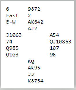 De som ikke fikk hektet Ø/V kom stort sett i 3NT. Det er i teorien maks ti stikk, men de som noterte +430 for ett overstikk i grand (bl.a. de som satt N/S mot vinnerparet) fikk under middels for det teoretiske maks resultatet. De som fikk tak i elleve stikk i 3NT fikk endel pluss, og noen fikk tolv men ble også de slått av rekken med fete scorer for doblede bet der Ø/V spilte kontrakt.
