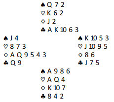 Det er på ingen måte nok stikk til å vinne denne utgangen om ikke kløverfargen blir godspilt. Det er dog et åpenbart problem, idet kløveren godspilles mot Ø/V få komme inn, og om det er øst som kommer inn er det lett å se at det går fryktelig galt om ruteren sitter slik som det ser ut, A-Q sjette (fra start) hos vest og to små hos øst. Øst spiller ruter gjennom syds konge, vest får fem ruterstikk og det blir to bet.