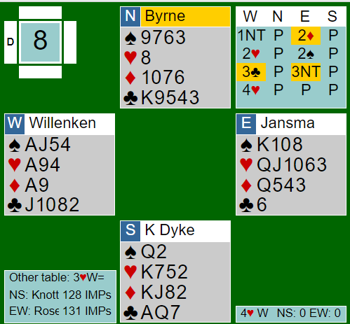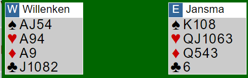 Jan P. Johannesen fikk Lise Tjønn som makker og i spill5 fikk han god hjelp av henne ved valg av kontrakt. Hun hørte en åpning 2 NT som iser jevn hånd og normalt 20-21 hp fra Jan P. i Nord og ugunstig sone. Hans Petter tavrum gikk i 2. hånd innpåmed 3 spar og Lise skulle svare med følgende: