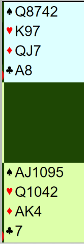 7 hp er jo ikke så mye, men god fordeling teller også og Lise strakk seg derfor til å melde 4 ruter. Da fikk Johannesen ambisjoner til høy kontyrakt da han alt hadde undermeldt hånden sin og satt med dette:
