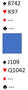 Fred Hansen spilte ut ru Jog det førte til at D, K og A også gikk i 1. stikk. Arne tok deretter de fire neste stående ruterstikkene fra dette: