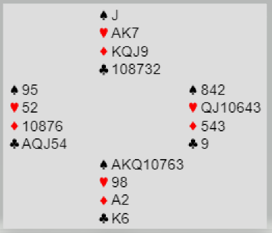 Så vest må spille kløver. Da kan spillefører gratis prøve tieren. Slik det satt vinner kløver 10 stikk, og to hjertere forsvinner fra syd på kløverstikkene. Tolv stikk uten å måtte gjette i hjerter. '