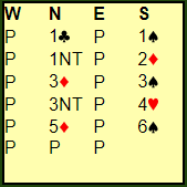 Syd har ikke så mange honnørpoeng, men det betyr ikke noe her hvor syd har så få tapere og flust med stikk. Hvor nord har noen «dumme» ruterhonnører som for eksempel K-J, Q-J eller K-Q, eller også bare en honnør som ikke er esset kan det dog bli litt for lite i de andre fargene. På den annen side, hvis nord har ess og konger i spar, hjerter og kløver kan det være nesten nedlegg tolv stikk. På en eller måte må syd få tatt med nord på råd med en sleminvitt, og nord bør i denne konteksten vite at selv med 12-13 poeng så er det hva slags honnører han har som er det viktige. Nord vet at makkeren inviterer til slem vel vitende om at nord har kun 12-14. En «skarp» minimums åpningshånd (topphonnører, ess og konger) vil gi gode muligheter for slem her.
