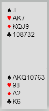 Selv med lite honnørpoeng kan det stå slem her fordi syd har en fantastisk fordelingshånd. Du har til rådighet checkback, la oss si såkalt dobbel checkback (XY) hvor 2 ruter er utgangskrav. Hvis du spiller med XY er 2 kløver meldingen som ber om 2 ruter hvoretter svarhånden passer, eller en melding til er i så fall utgangsinvitt. Med det systemet bør hopp til 3 spar over 1NT spilles som utgangskrav som fastsetter trumfen og ber om cuebids, en mulighet med disse kortene.